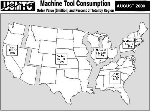 August machine tool consumption in the Midwestern Region rose to $123.50 million, up 8% compared to July's $114.40 million, but down 24.6% compared to August a year ago. Year-to-date machine tool consumption stood at $1.1 billion, down 11.6% compared to the same period in 1999.