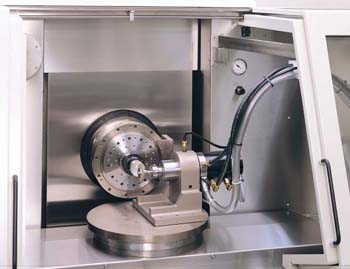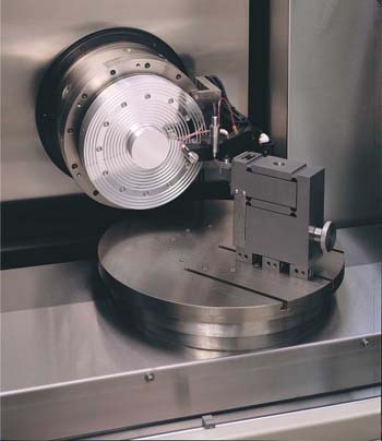 Single-point diamond turning machines are often provided with add-on grinding attachments to extend their application to those materials that are not diamond machinable. This approach provides an extremely flexible machining system, but extreme care must be taken at the earliest design stage to ensure that the stiffness of the machine is capable of handling the increased grinding forces, and that guarding and coolant containment measures are up to the increased demands. Due to the limited space available, the grinding attachment may also be limited to a single spindle. This might then require wheels to be changed more often than desired for rough grinding and finish grinding operations.
