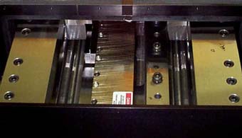 Many advanced design features are built into such a machine. An example of this is the integral axis configuration to improve system stiffness, reduce thermal effects, and reduce geometrical errors. The view below demonstrates this technique. Note how the vertical Y axis is buried within the Z axis, rather than stacked one above the other. Also shown is a non-influencing, air bearing counter balance, to allow the vertical axis to be tuned to optimum performance, bi-directionally.